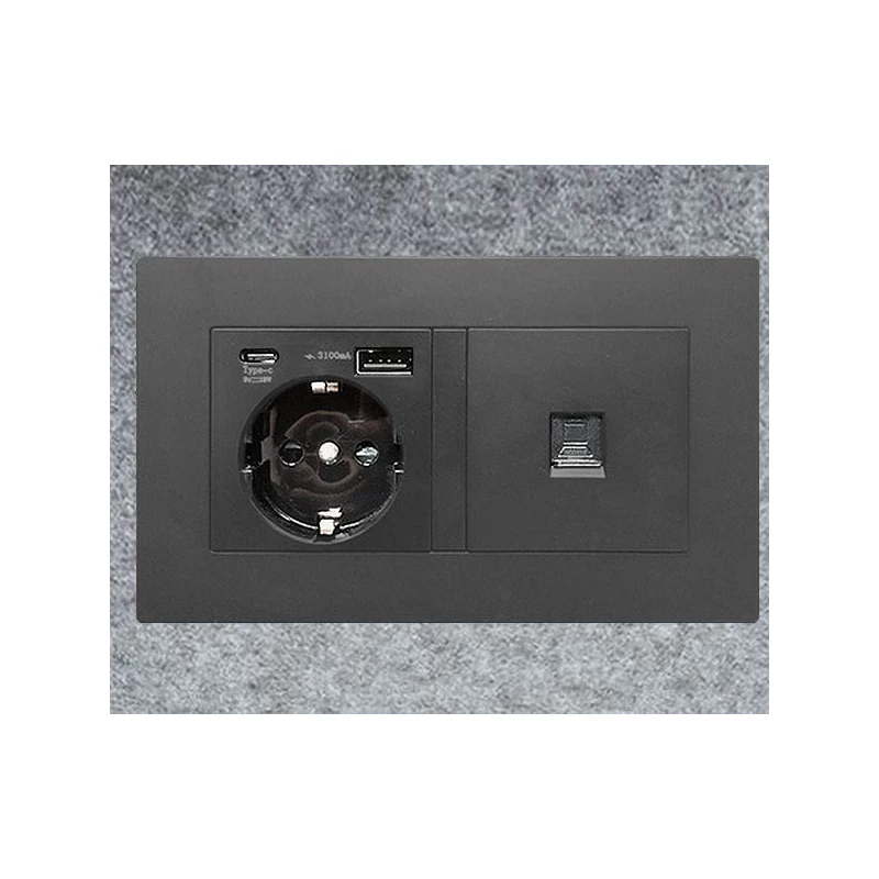 1 toma corriente 220v (EU) + USB A y C de carga + RJ45 para datos. Conexión exterior a red mediante punto de conexión normalizada.