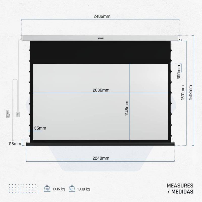 La pantalla eléctrica PSIXS203 de iggual representa la innovación en soluciones de proyección. Con un tamaño de 203x114 cm y formato panorámico 16:9, su superficie de 4 capas garantiza imágenes vibrantes y con alto contraste. Gracias a su sistema eléctrico, el manejo es cómodo y sencillo, mientras que los cables tensores incorporados mantienen la pantalla completamente plana, evitando arrugas y distorsiones, una característica que marca la diferencia frente a opciones convencionales. Su diseño avanzado permite una instalación versátil en techo o pared, adaptándose a cualquier espacio profesional.