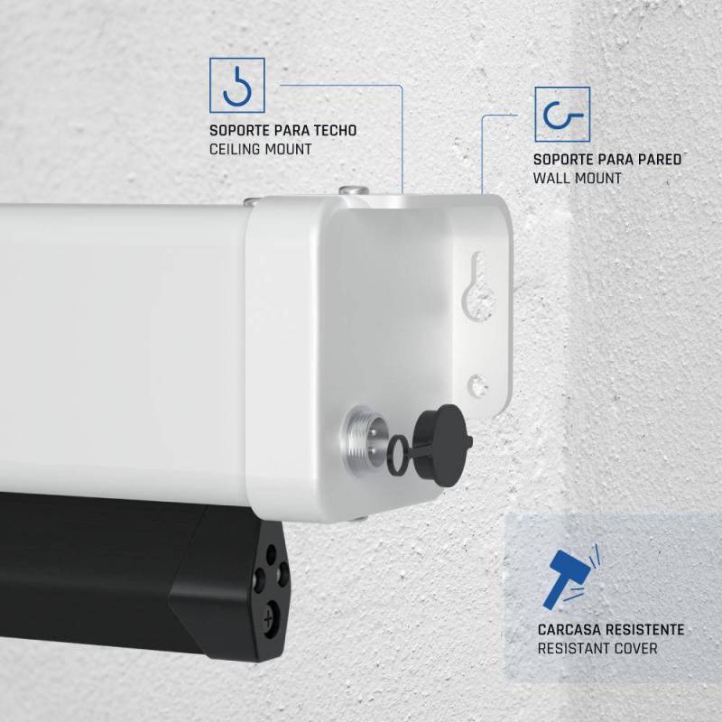 Características | - Formato 16:9 - Área visible de 92" (203 x 114 cm) - Bordes negros laterales de 6,5 cm - Carcasa blanca y a prueba de polvo - Se puede instalar tanto en techo como en pared - Tela compuesta de 4 capas - Parte trasera negra mate para mayor refracción de la luz - Sistema de tensión lateral - Muy buena planeidad libre de arrugas gracias a los cables de tensión - Voltaje 230 VAC- Frecuencia 50Hz - Salida del cable de alimentación a la izquierda / derecha (a elegir por el usuario) - Incluye control de pared y mando remoto infrarrojo (IR) - Factor de ganancia de 1.0, ideal para cine en casa y presentaciones - La caída de la pantalla puede ser frenada en cualquier punto, por lo que se puede ajustar la longitud de la pantalla a cualquier formato - La barra inferior queda al ras con la carcasa - Ideal para cualquier tipo de proyector, SVGA, XGA, 3D, HD, Full HD, 4K y 8K - Alta calidad y durabilidad |
