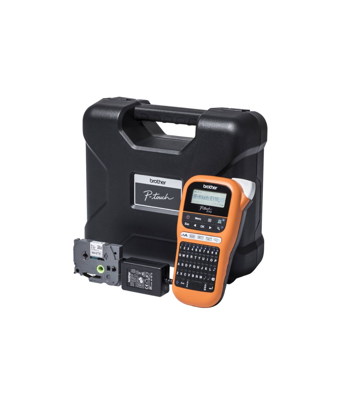 IncluyeCinta laminada flexible de identificación negro sobre blanco 9mm x 8m, adaptador de corriente y maletín de transporte.