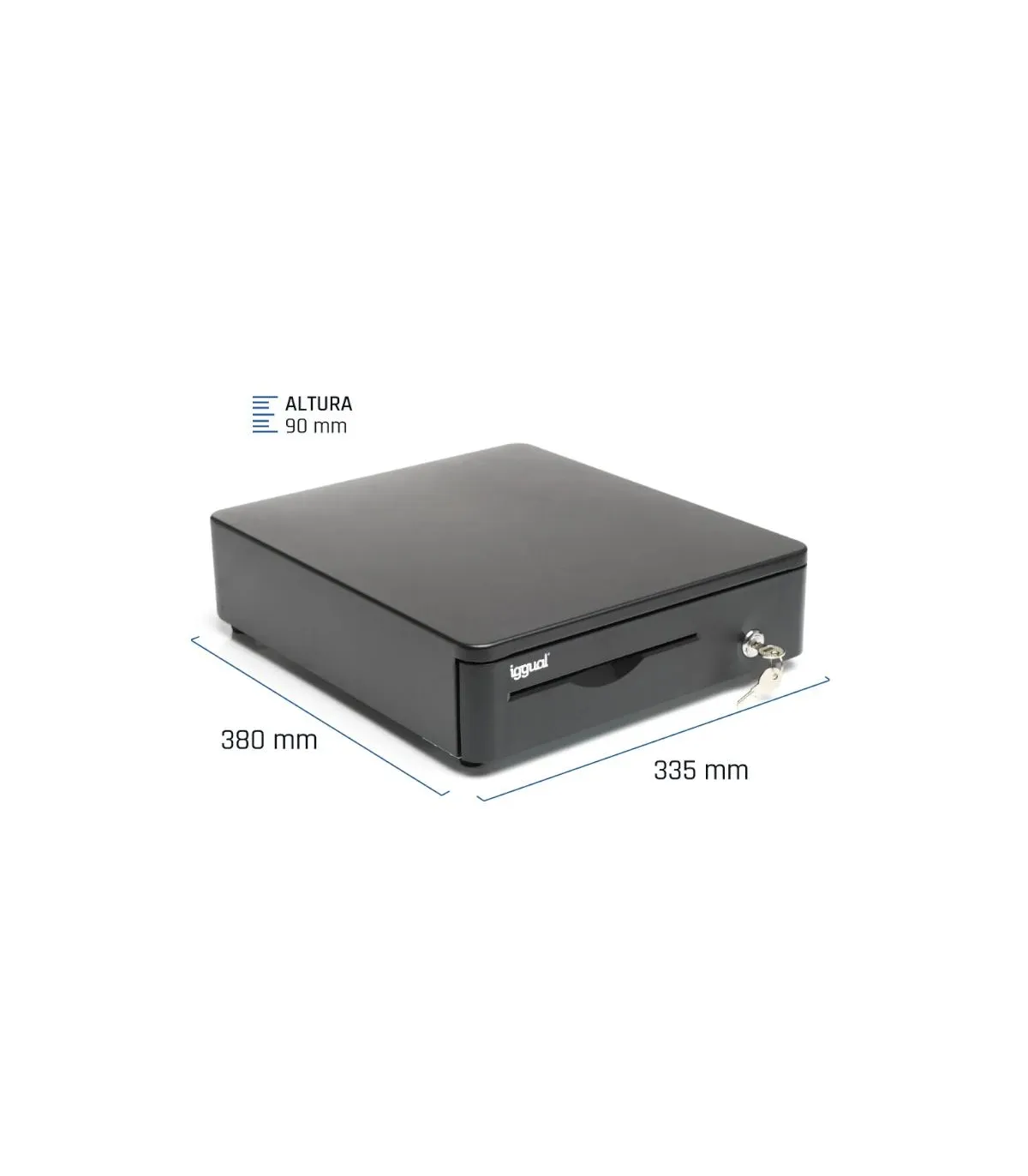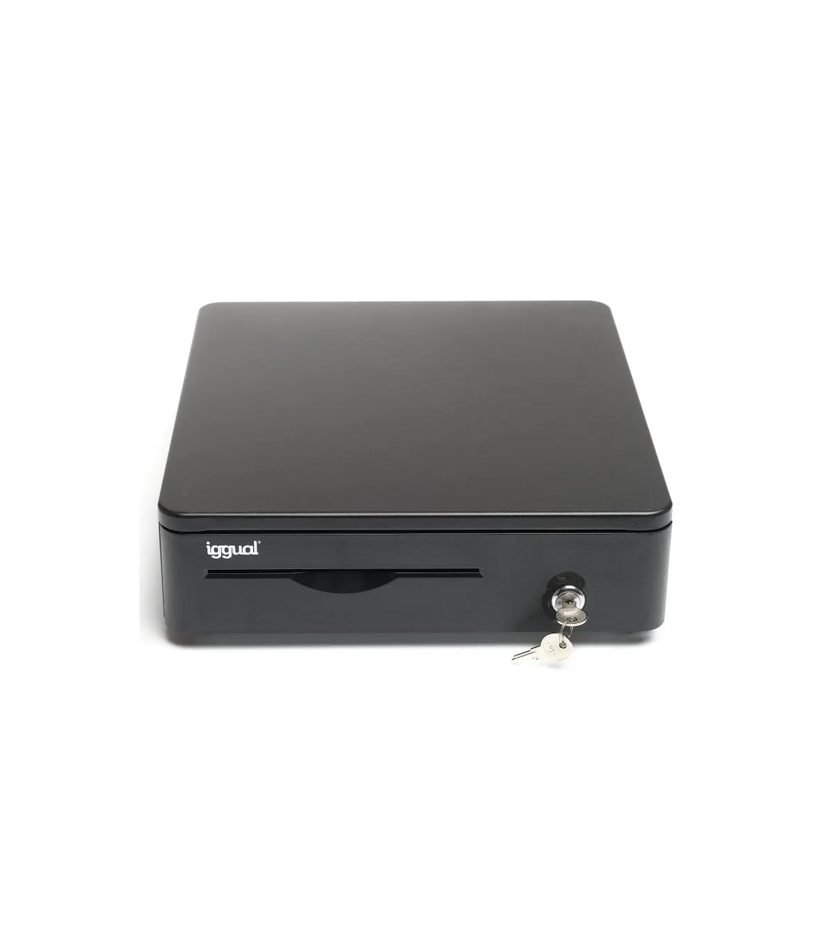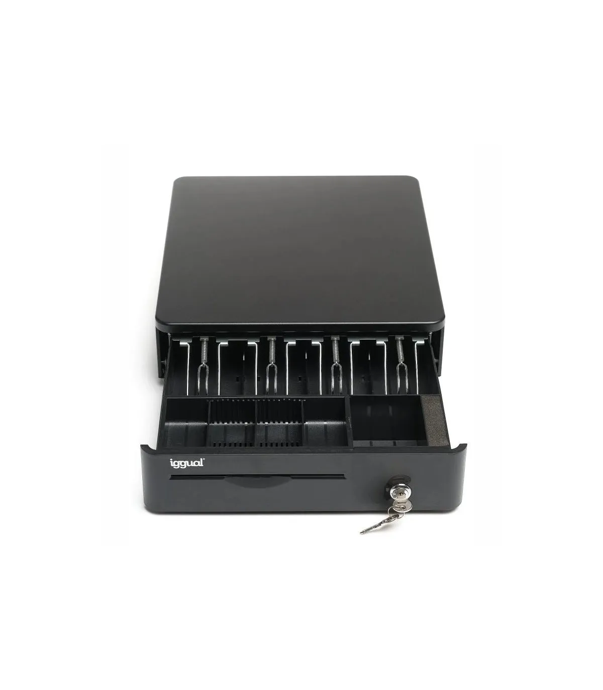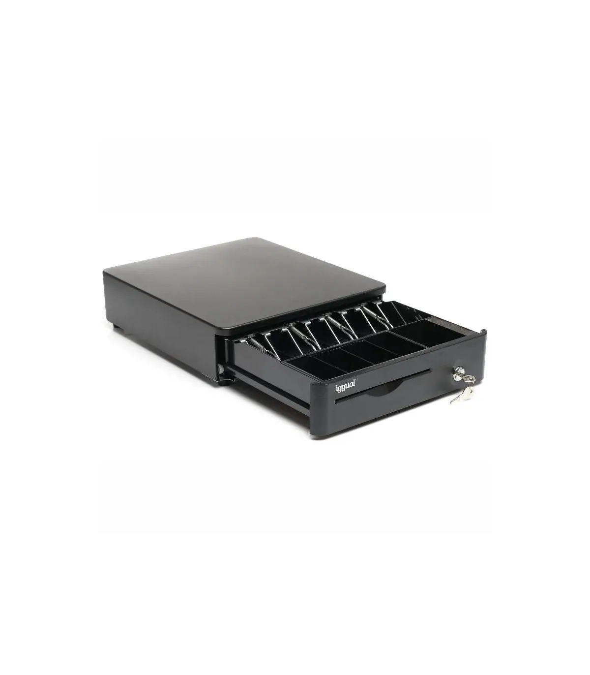 | Características | - Ranura de acceso frontal para cheque, recibo, etc. - Rodillos de cojinete de bolas de alta resistencia - Cerradura de tres posiciones de bloqueo - Apertura manual o automática - Compartimentos: 4 billetes y 5 monedas (1 fijo + 4 ajustables) - Interfaz RJ11 (alimentación 12V) - Incluye cable RJ11 de 1 metro de longitud - Dimensiones: 380 (profundo) x 335 (ancho) x 90 (alto) mm - Peso neto: 3,6 kg - Peso bruto: 4,6 kg - Humidificador de yemas - Bordes redondeados - Color: negro - Juego de 2 llaves |