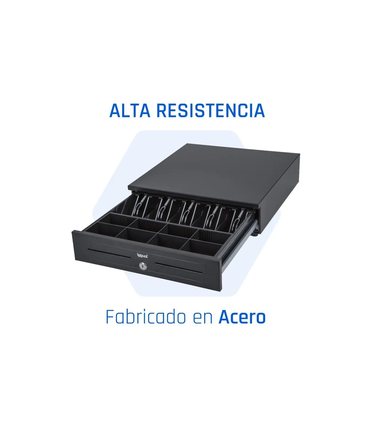El IRON-HD de iggual es el cajón portamonedas definitivo para aquellos negocios que requieren un equipo robusto, fiable y preparado para los volúmenes de trabajo más altos. Fabricado en acero galvanizado de alta densidad, este modelo está diseñado para durar, incluso en las condiciones más exigentes del entorno comercial.