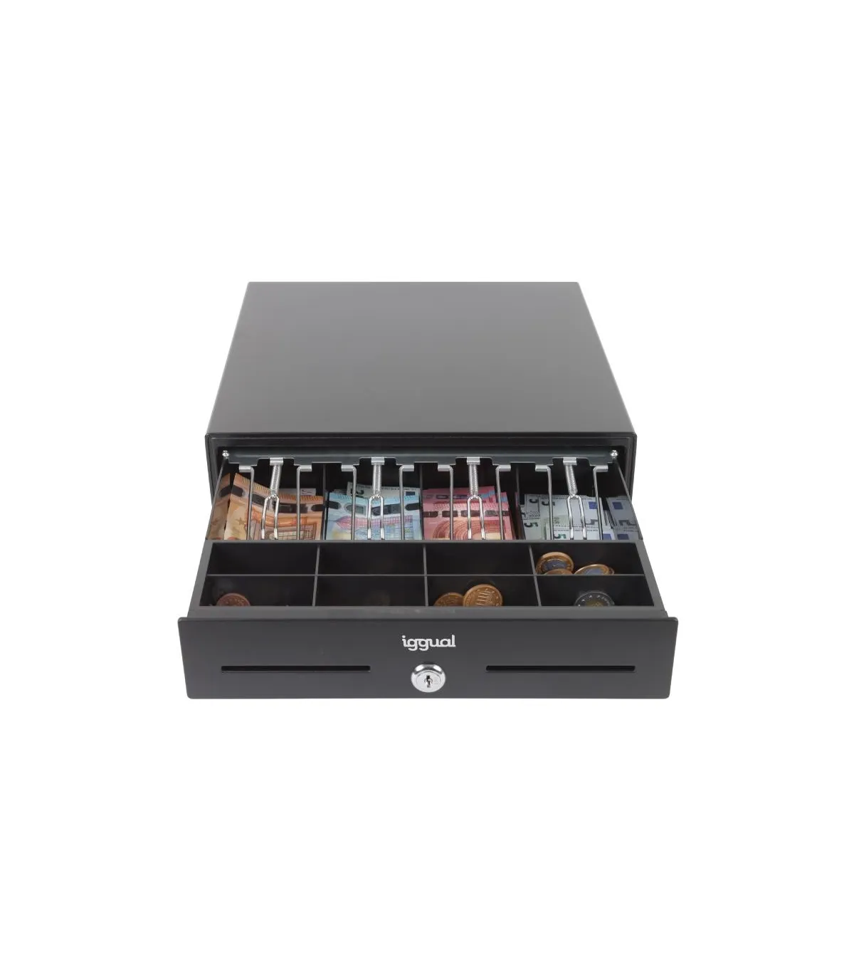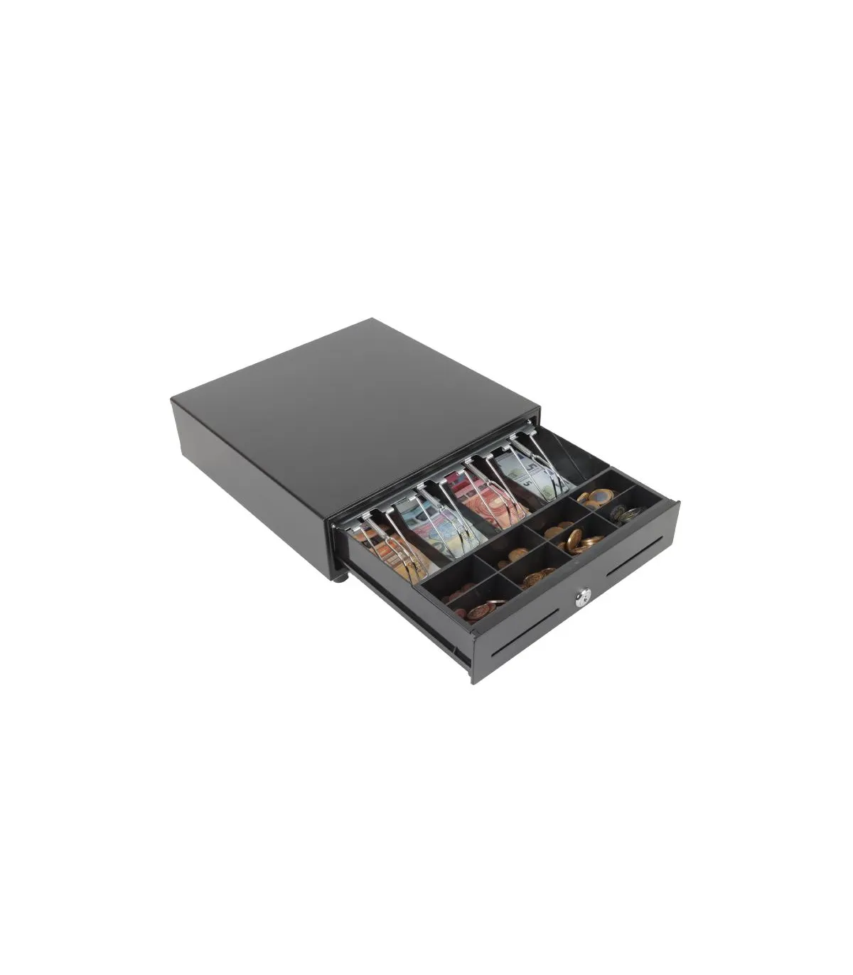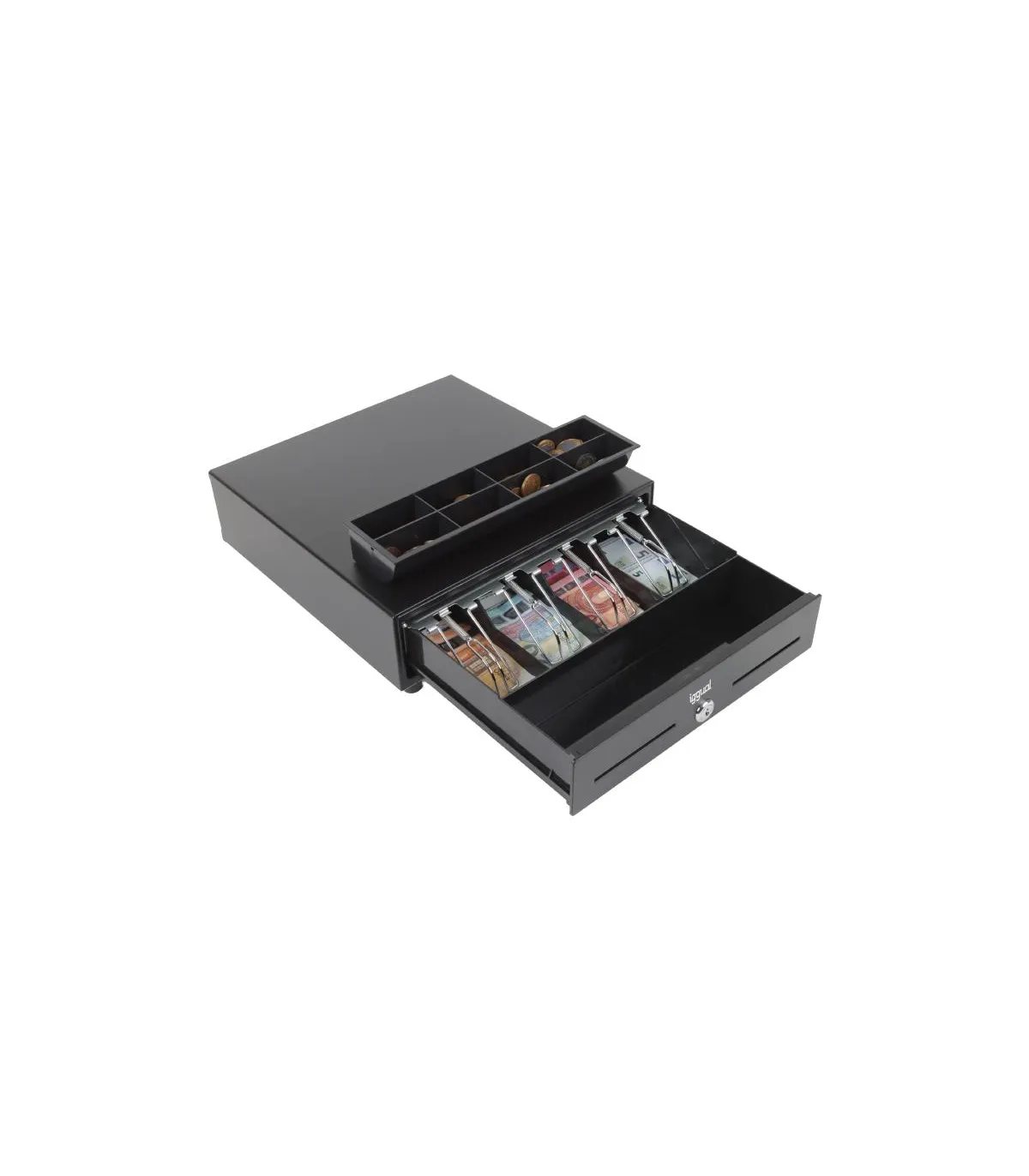 | Características | - Dos ranuras de acceso frontales - Panel frontal de acero - Rodillos de cojinete de bolas de alta resistencia - Cerradura de tres posiciones de bloqueo - Apertura manual o automática - Compartimentos: 4 billetes y 8 monedas - Bandeja de monedas extraíble con espacios ajustables - Interfaz RJ11 (alimentación 12V) - Incluye cable RJ11 de 1 metro de longitud - Medidas: 330 ancho x 333 profundo x 90 alto mm - Peso neto: 3,3 kg - Peso bruto: 3,9 kg - Color: negro |