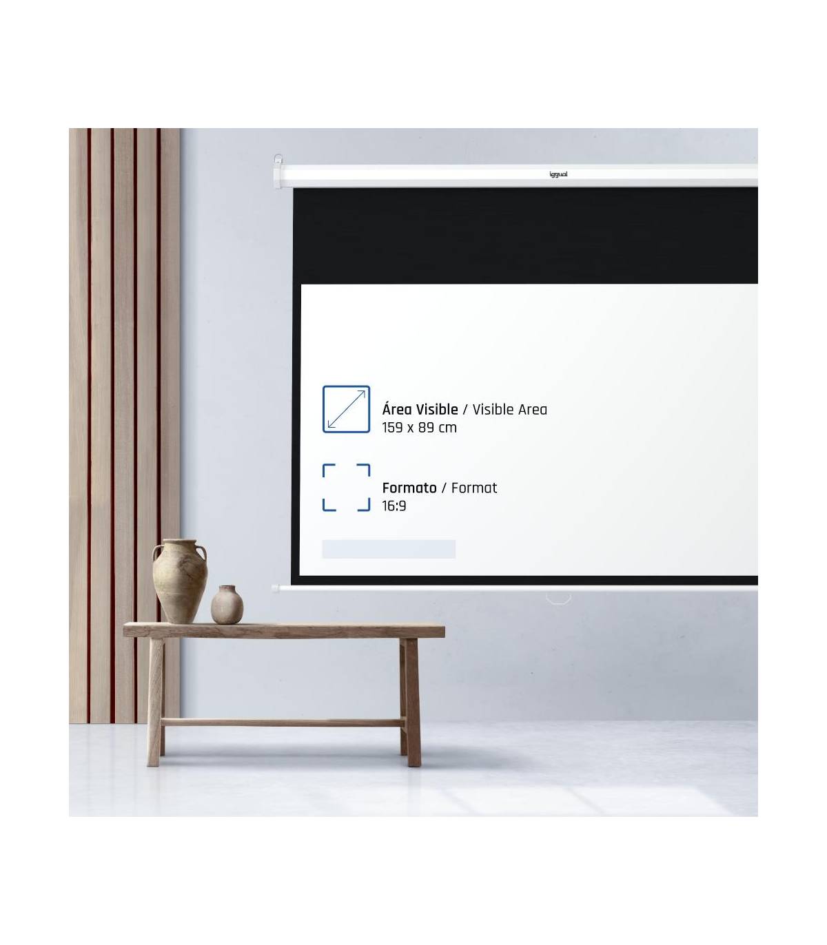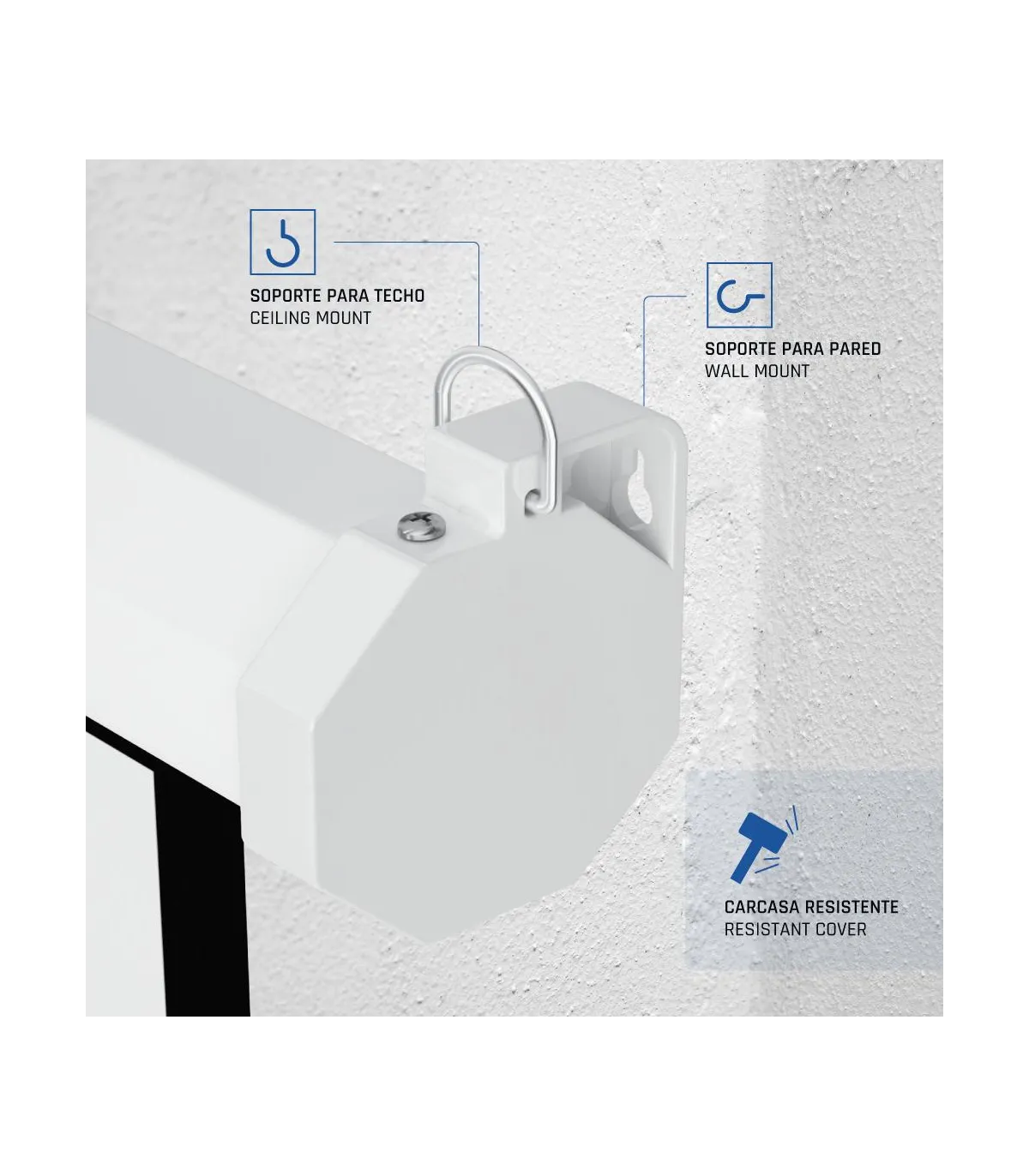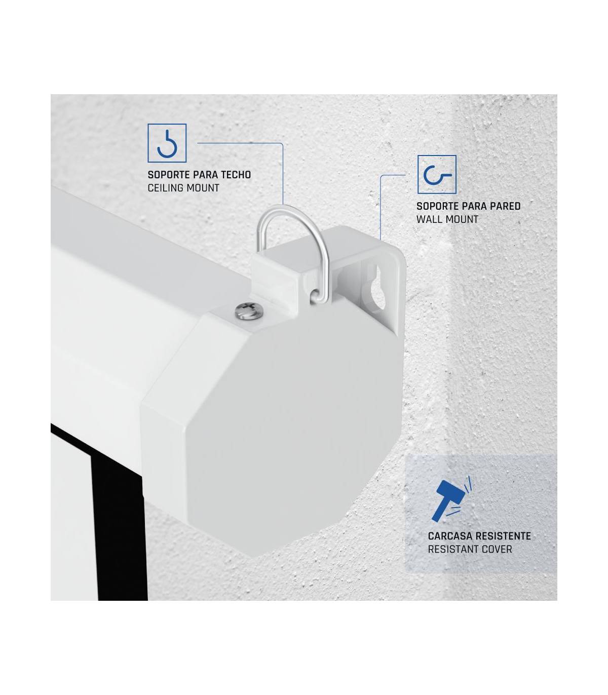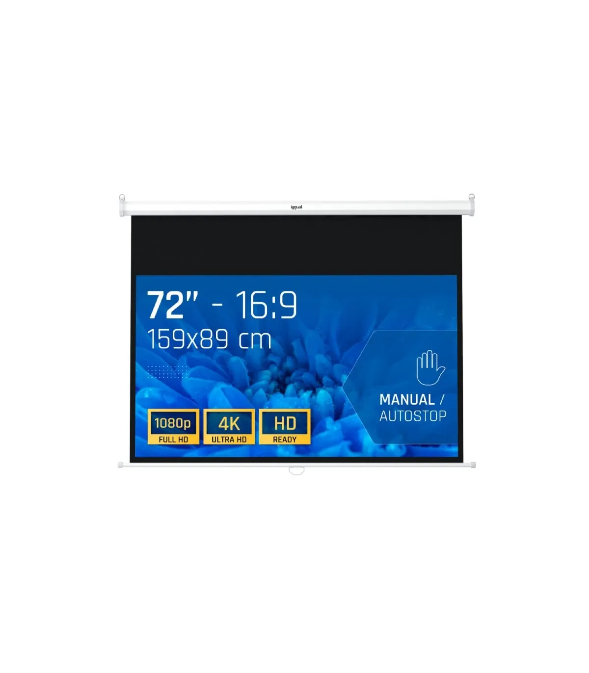 | Características | - Formato 16:9 - Área visible de 92" (159 x 89 cm) - Factor de ganancia: 1.0 - Auto-Stop: ajustable a cualquier altura - Material cajetín: acero - Carcasa blanca y a prueba de polvo - Se puede instalar tanto en techo como en pared - Tela compuesta de 4 capas - Trasera negra opaca - Bordes negros laterales de 3 cm - Fácil montaje - Alta calidad y durabilidad - Ideal para cine en casa y salas de conferencias - Ideal para cualquier tipo de proyector, SVGA, XGA, 3D, HD, Full HD y 4K - NOTA IMPORTANTE: no incluye tornillería, tacos ni ganchos para su instalación |