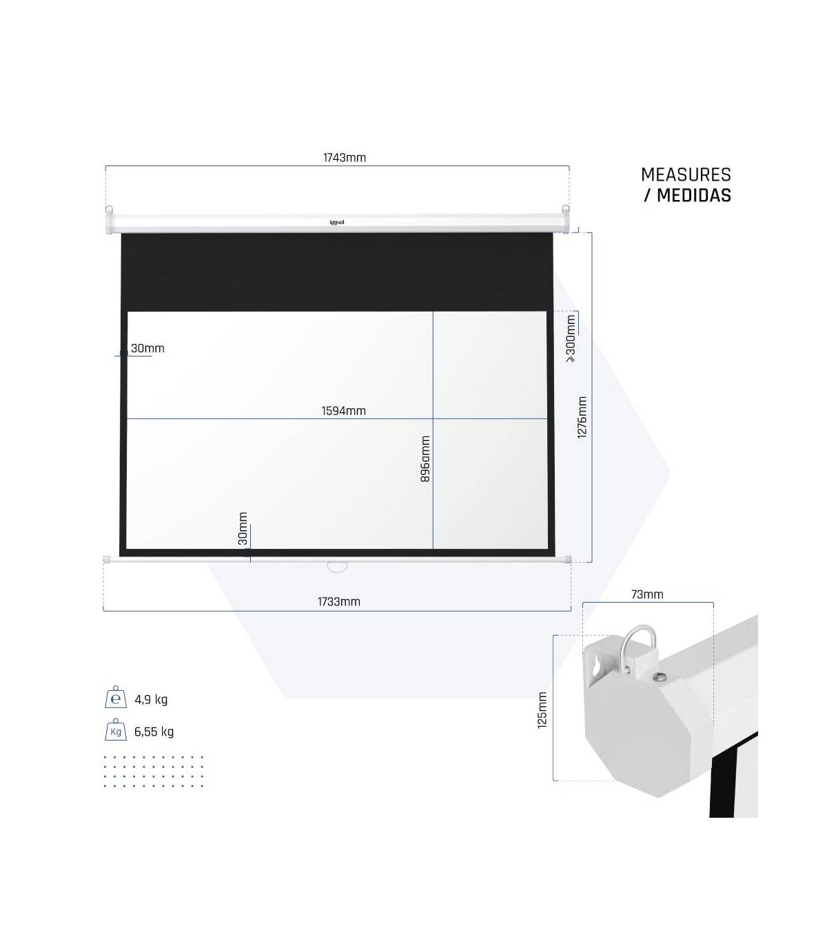 | Medidas | - Área de visualización: 159 x 89 cm - Cajetín: 174 x 7,3 x 12,5 cm |