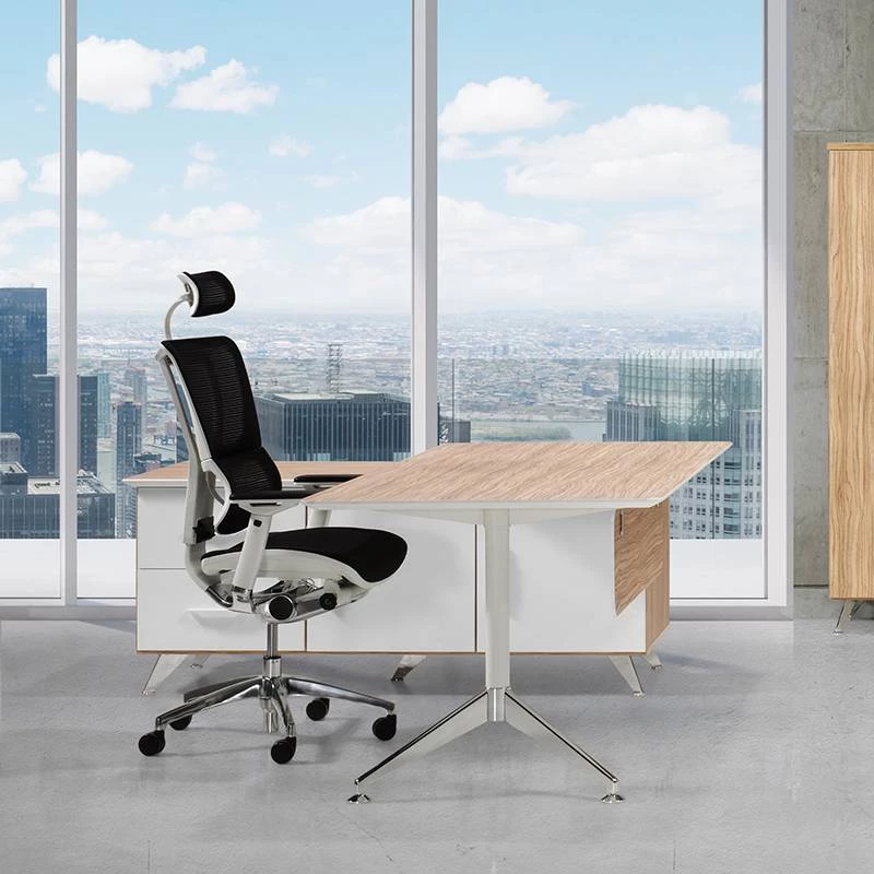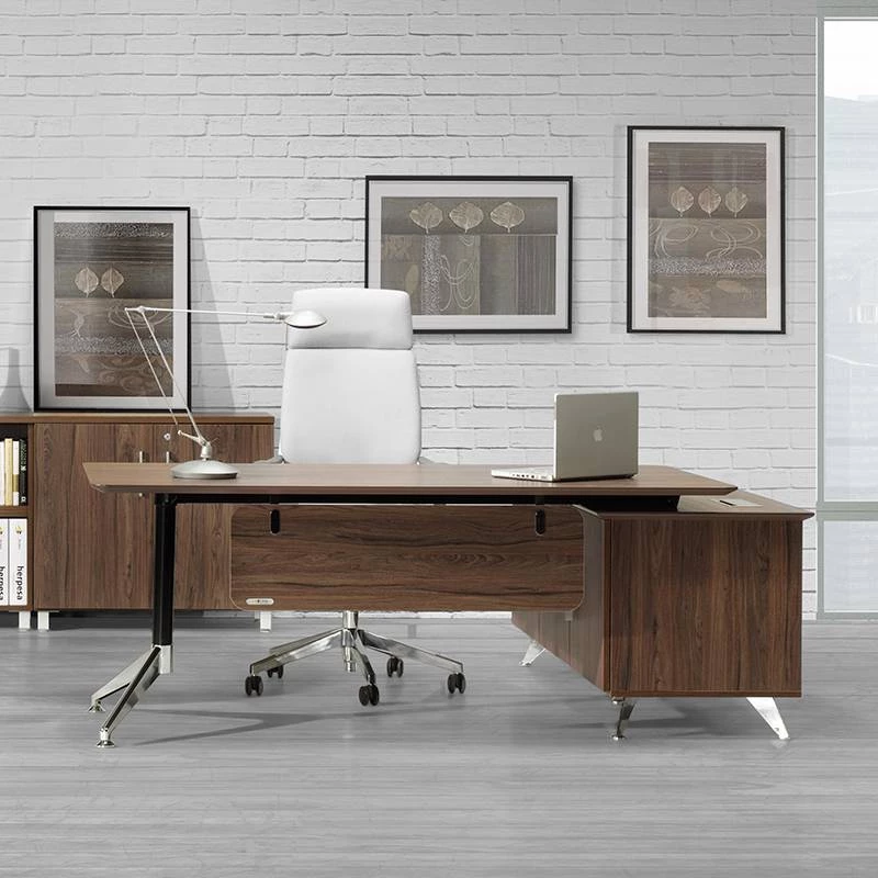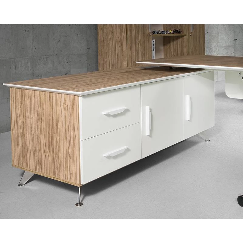 Esta mesa de despacho impone un una gran presencia y elegancia gracias a sus múltiples acabados y pies cromados en forma de v. Ideal para cualquier despacho.