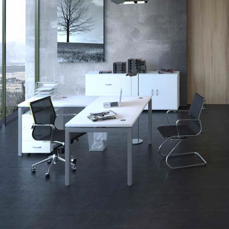 Este diseño de mesa crea espacios diversas de formas ligeras. Cuenta con tapas de bilaminado de 30 mm. de grosor con pasacables. Los laterales son patas de metal en forma de portería con reguladores de altura para corregir imperfecciones del suelo y una viga extensible que permite canalizar cables.