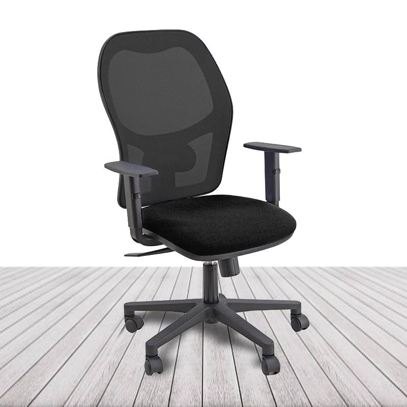 Silla Operativa Unisit tapizada en tela con base de nylon negro. Respaldo y asiento sincronizados. Respaldo de malla.